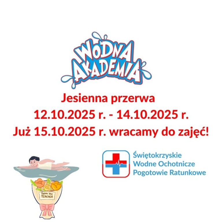 Jesienna przerwa w zajęciach Wodnej Akademii Z okazji Dnia Edukacji Narodowej pragniemy podziękować wszystkim naszym trenerom i nauczycielom za zaangażowanie, pasję i codzienny wysiłek, jaki wkładają w naukę i rozwój n...